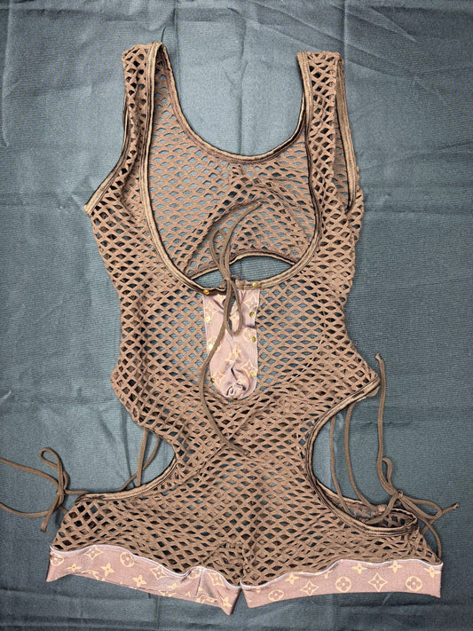 Brown Designer/Brown Fishnet Sleeveless Bikini Top Romper Lingerie Outfit