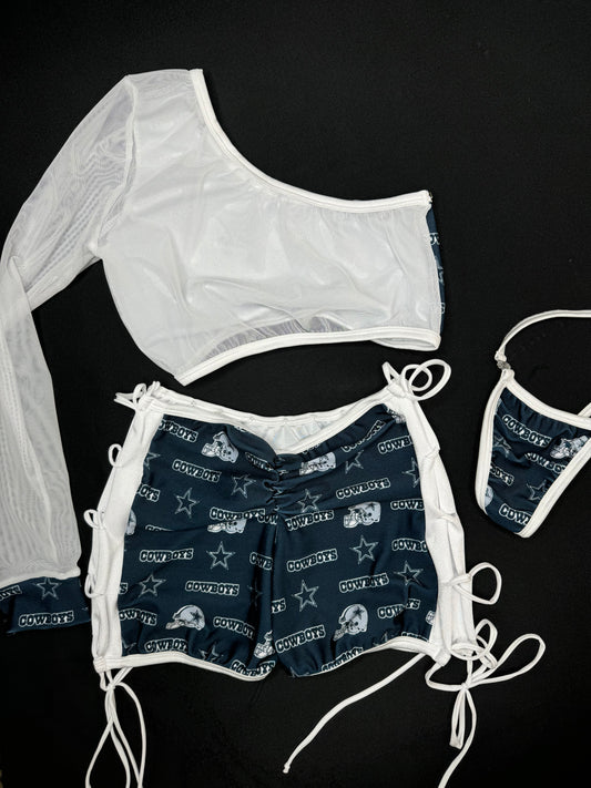 Blue Cowboys Spandex/White Mesh Two-Piece Single Sleeve/Shorts Lingerie Outfit