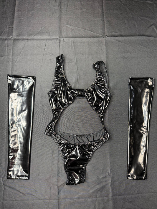 Black Latex One-Piece Lingerie Outfit with Sleeves