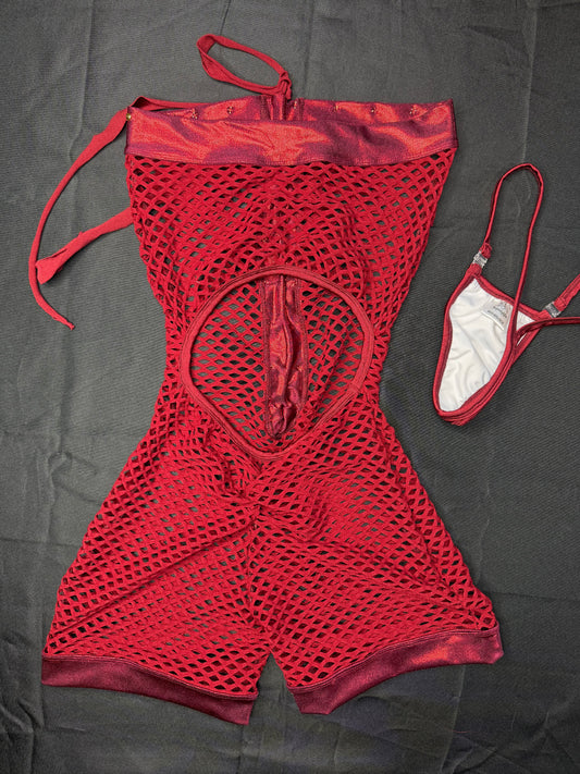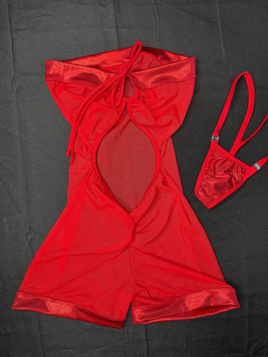 Metallic Red Spandex/Red Mesh One-Piece Lingerie Outfit