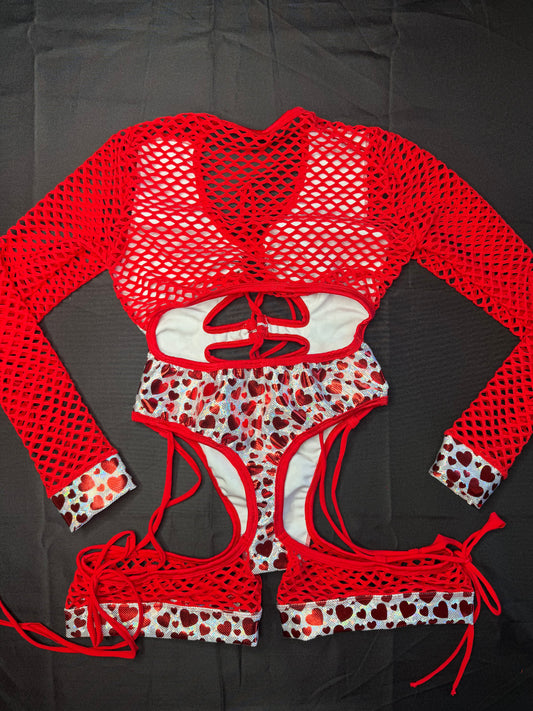 Metallic Hearts/Red Fishnet Spandex Long Sleeve Romper Lingerie Outfit