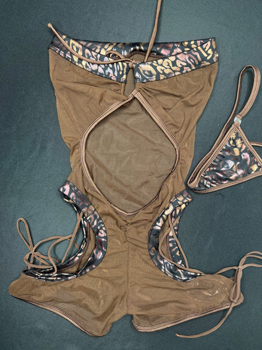 Bronze Animal Print One-Piece Sling-Shot Lingerie Outfit