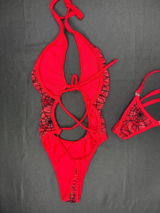 White Mesh/Red Glitter Flame Black Fishnet One-Piece Romper Lingerie Outfit
