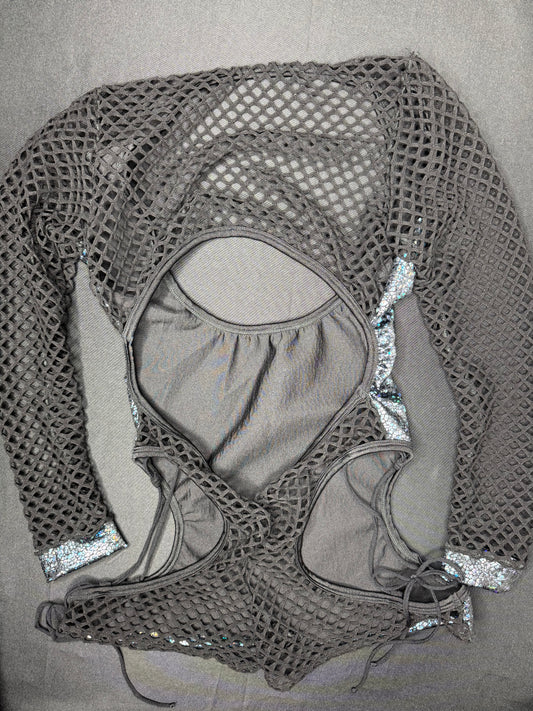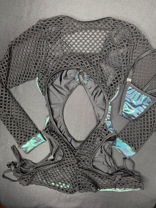 Metallic Black/Black Fishnet Romper Lingerie Outfit