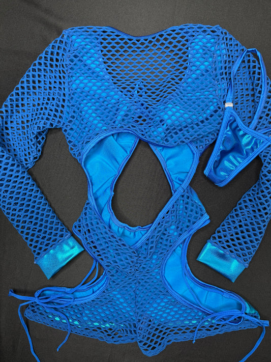 Royal Blue Fishnet/Spandex Ombré One-Piece Romper Lingerie Outfit