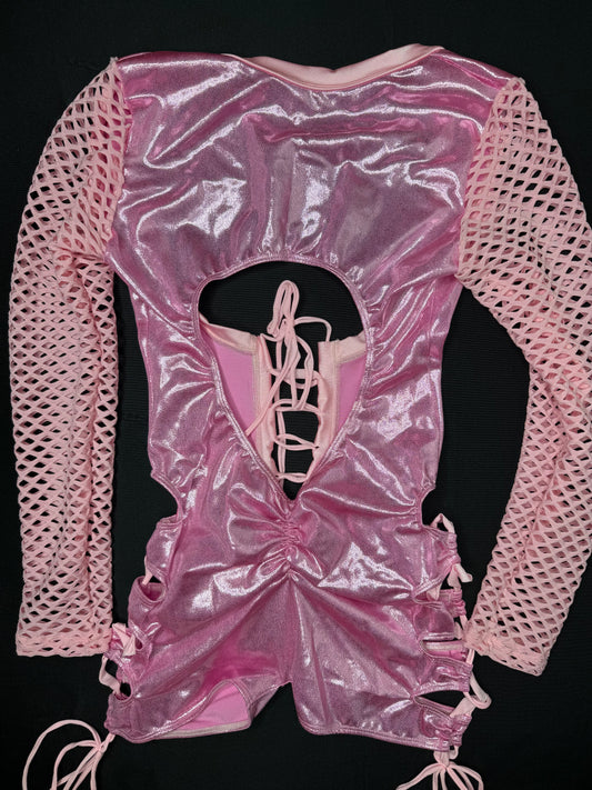 Pink Microdot Spandex/Baby Pink Fishnet One-Piece Romper Lingerie Outfit