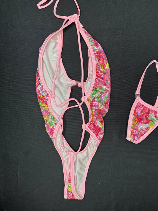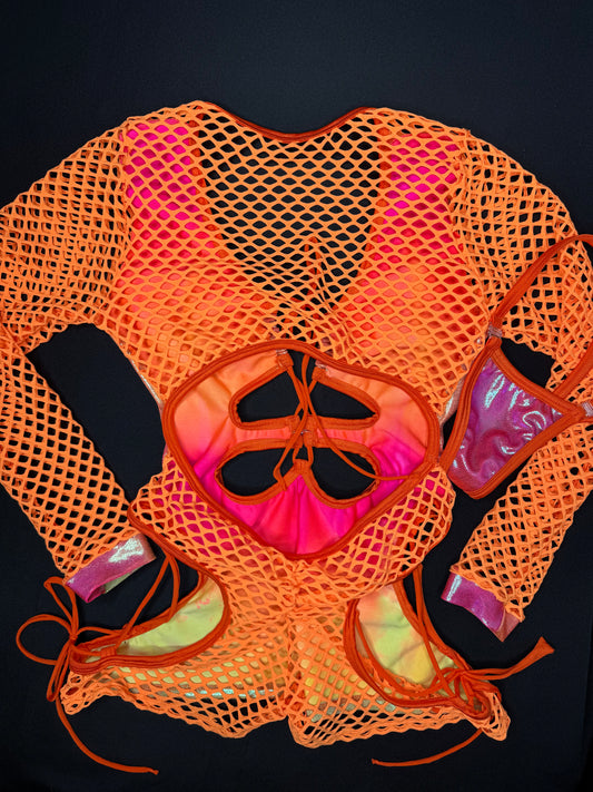Pink/Yellow Ombré/Orange Fishnet Romper Lingerie Outfit