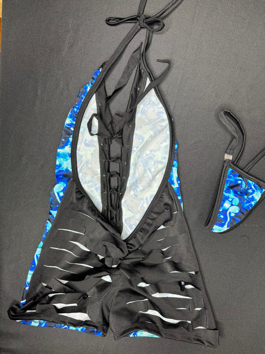 Blue/Black Spandex One-Piece Ripped Back Lingerie Outfit
