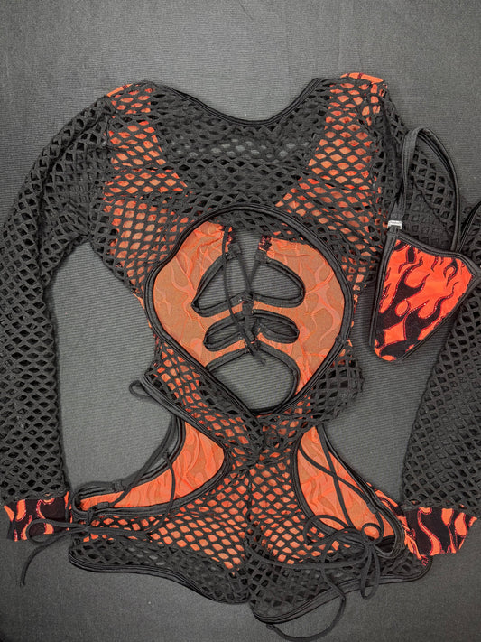 Orange Mesh/Black Fishnet One-Piece Romper Lingerie Outfit