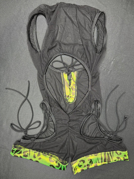 Metallic Green Tiger Stripe/Black Mesh Sleeveless Romper