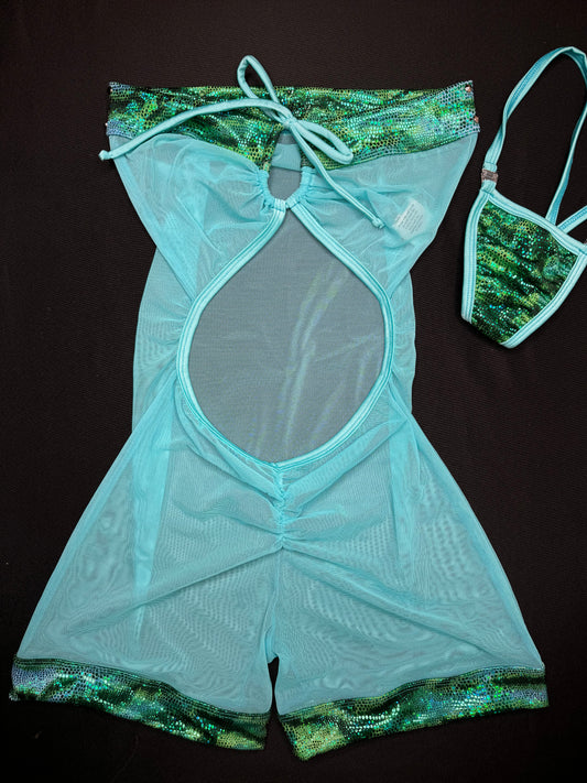 Metallic Green/Blue Mesh One-Piece Lingerie Outfit