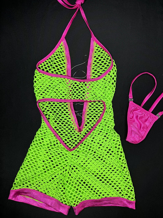 Neon/Pink One-Piece Fishnet Lingerie Outfit