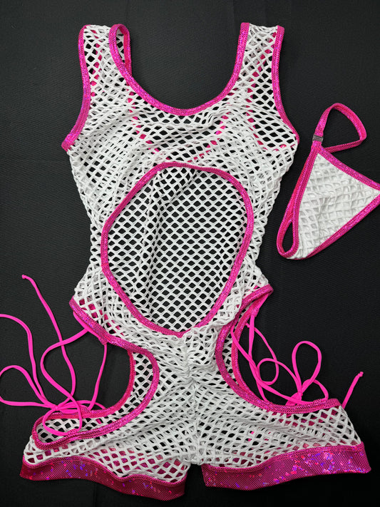 Hot Pink/White Fishnet Romper Exotic Dancer Outfit