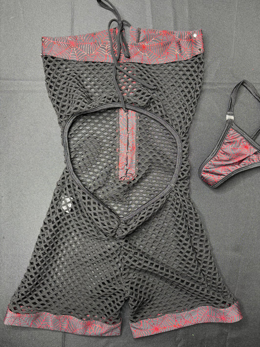 Red Web/Black Fishnet One-Piece Exotic Dancer Outfit