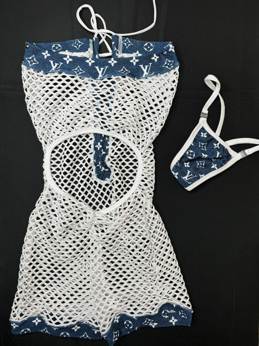 Denim Spandex/White Fishnet One-Piece Exotic Dancer Outfit