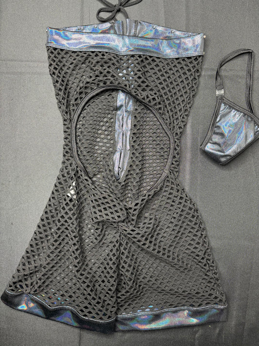 Metallic Black/Black Fishnet One-Piece Exotic Dancer Outfit