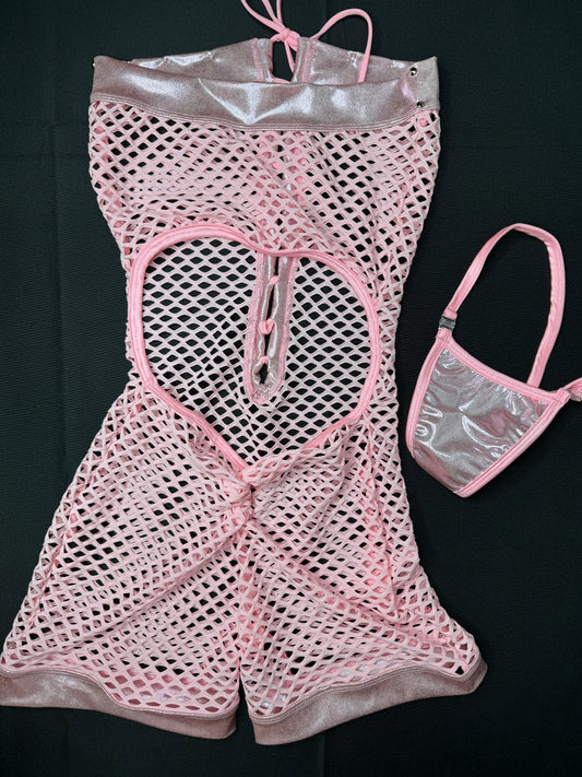 Metallic Pink/Baby Pink Fishnet One-Piece Exotic Dancer Outfit