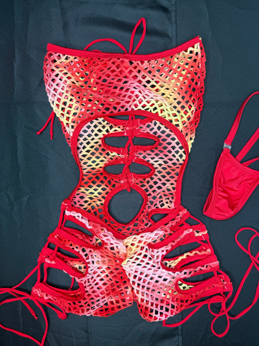 Red Ombré Fishnet One-Piece Lingerie Outfit