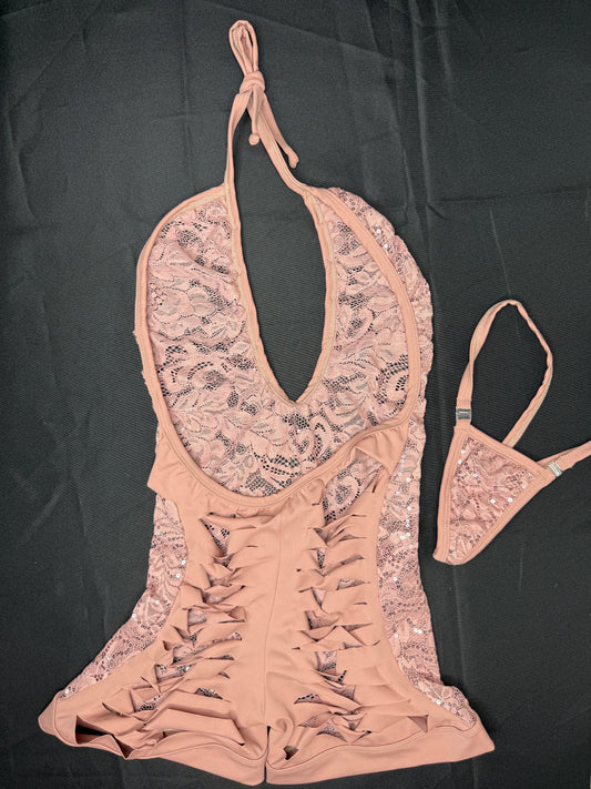 Nude Sequins Lace One-Piece Ripped Back One-Piece Lingerie Outfit