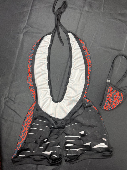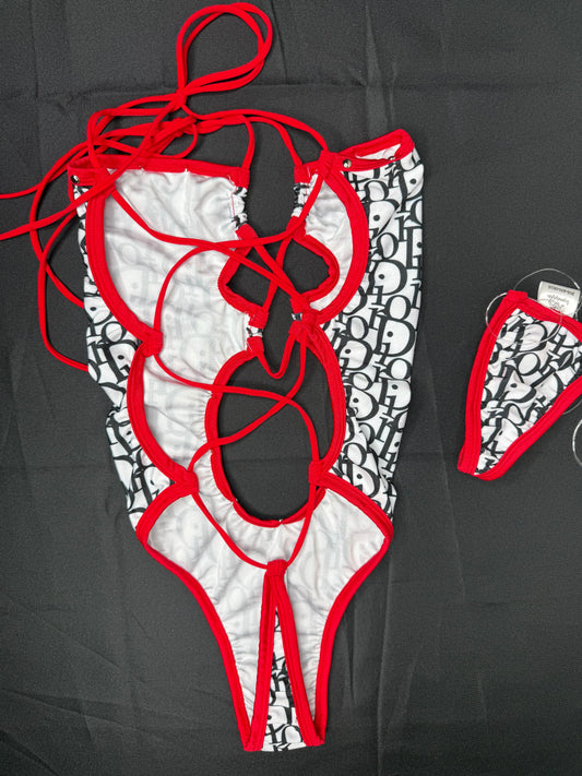 White Designer/Red Spandex One-Piece Lingerie Outfit