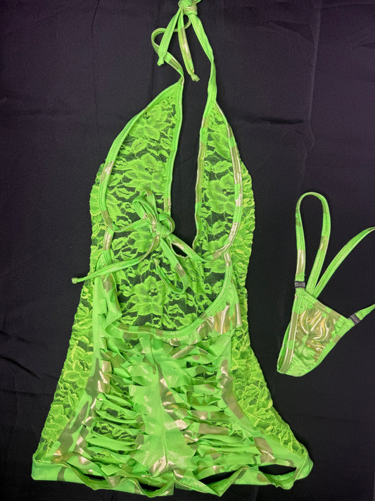Neon Green Lace/Spandex Ripped Back One-Piece Lingerie Outfit