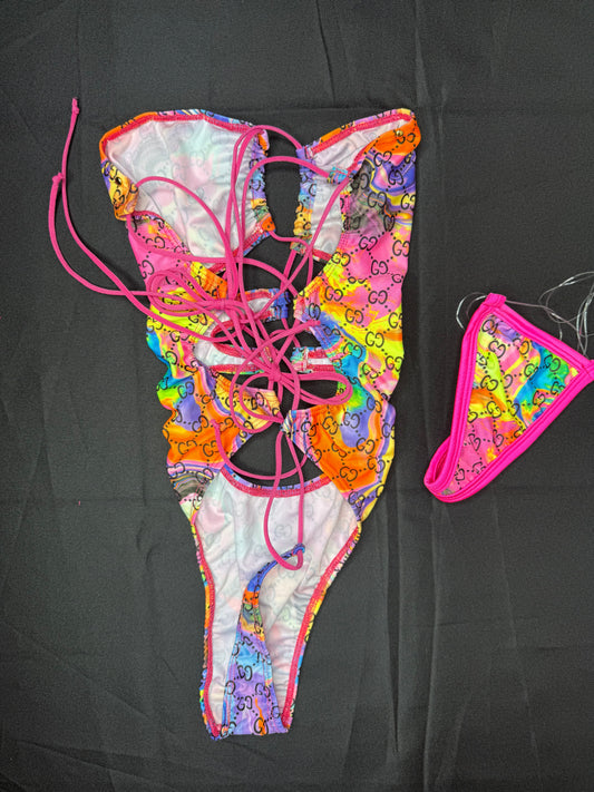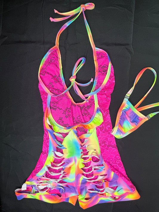 Hot Pink Lace/Rainbow Spandex Ripped Back One-Piece Lingerie Outfit
