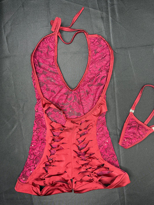 Burgundy Sequins Lace Ripped Back One-Piece Lingerie Outfit