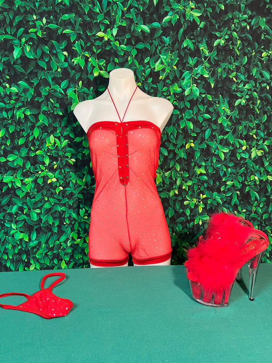Red Mesh One-Piece Outfit with Silver Sparkles.