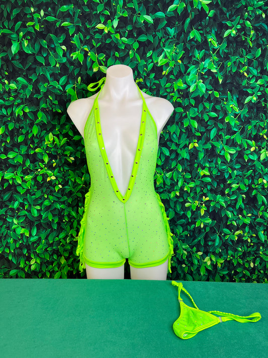 One-Piece Lime-Green Deep V Outfit With Fringe