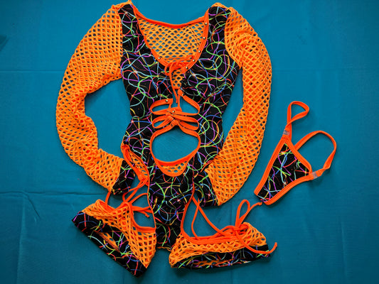 Orange Fishnet/Confetti Stretch Fabric One-Piece Romper Outfit