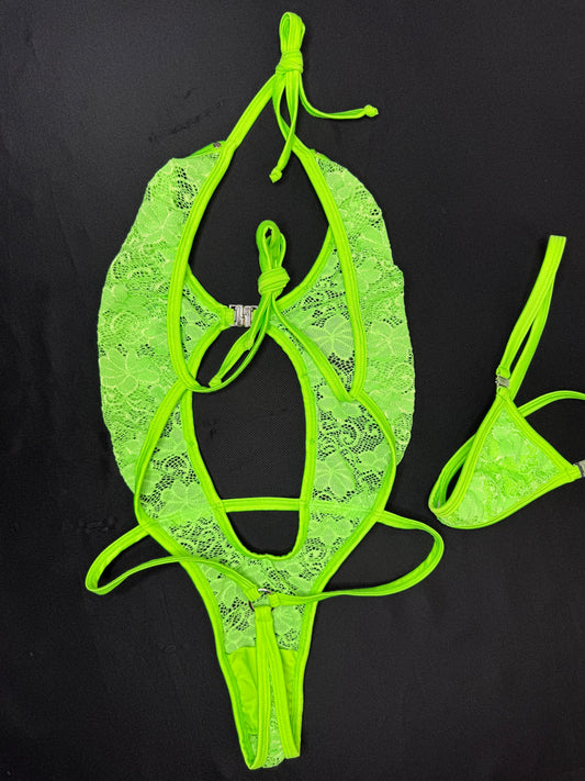 Neon Green Lace One-Piece Lingerie Outfit
