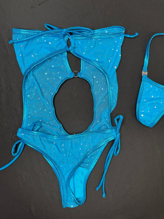 Turquoise Mesh/Metallic Turquoise Spandex One-Piece Lingerie Outfit