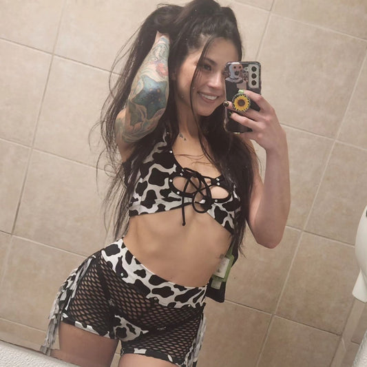Cow Print Two-Piece Lingerie Set for Exotic Dance Fringe Shorts