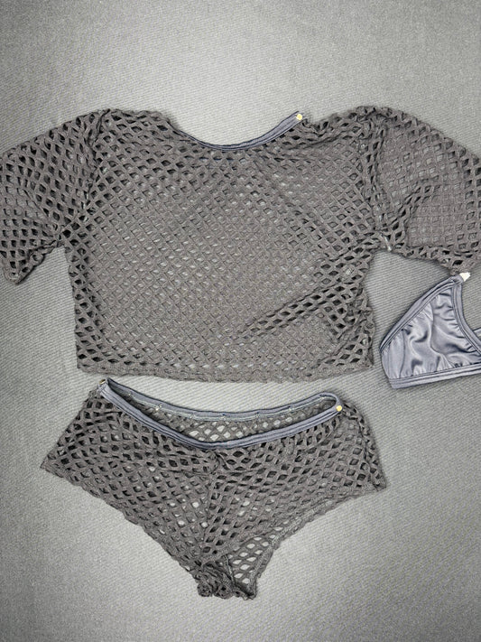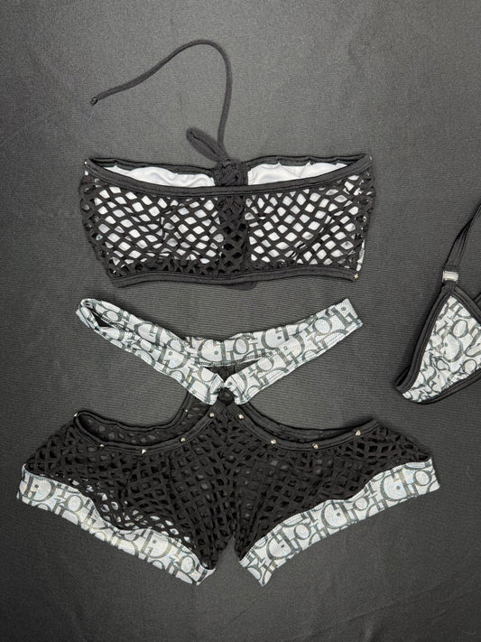 Silver Designer/Black Fishnet Spandex Tube-Top/Shorts Two-Piece Lingerie Outfit