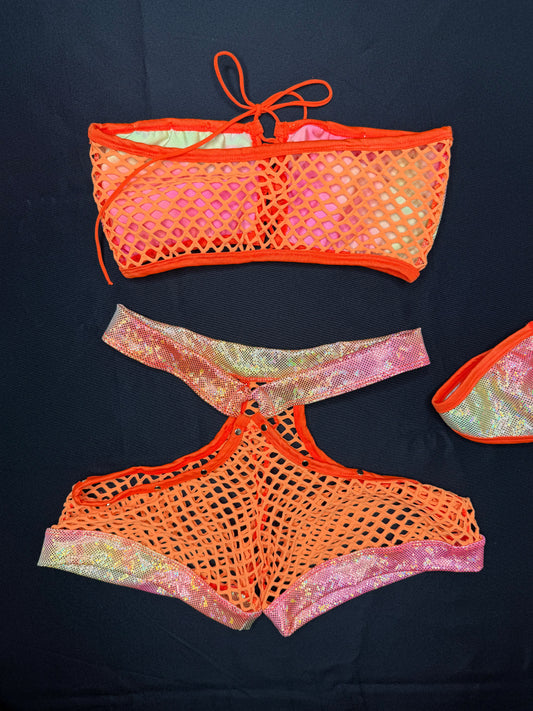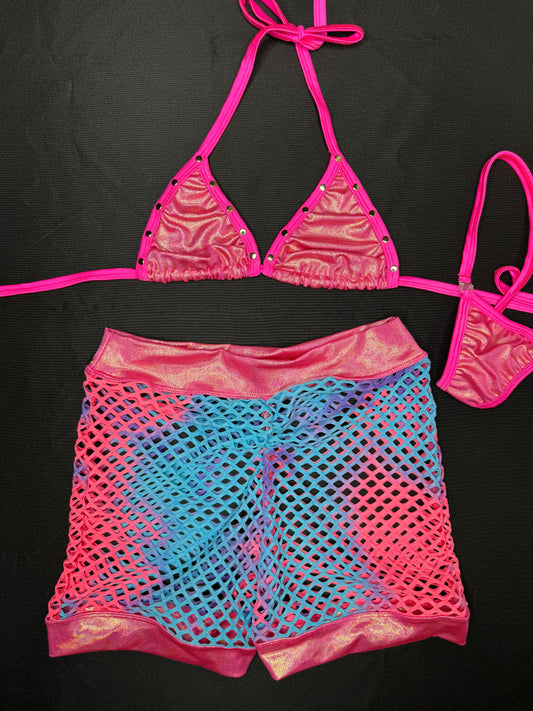 Metallic Hot Pink/Cyan Ombré Fishnet Spandex Shorts/Bikini Top Two-Piece Lingerie Outfit
