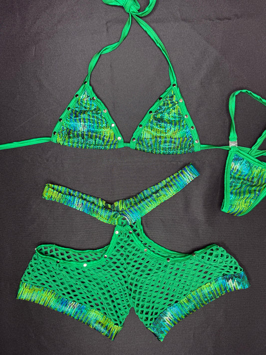 Metallic Green/Fishnet Green Bikini Top/Shorts Two-Piece Lingerie Outfit