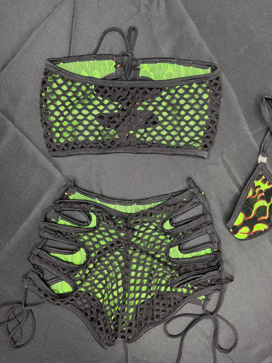 Green Fire Mesh/Black Fishnet Two-Piece Tube Top/Shorts Lingerie Outfit