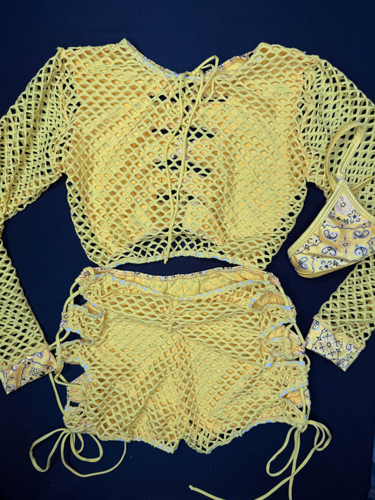 Yellow Bandana/Fishnet Spandex Long Sleeve Top/Shorts Two-Piece Lingerie Outfit