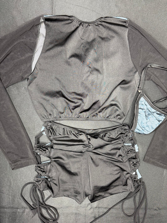 Blue/Grey Designer Spandex/Black Mesh Long Sleeve/Shorts Lingerie Outfit