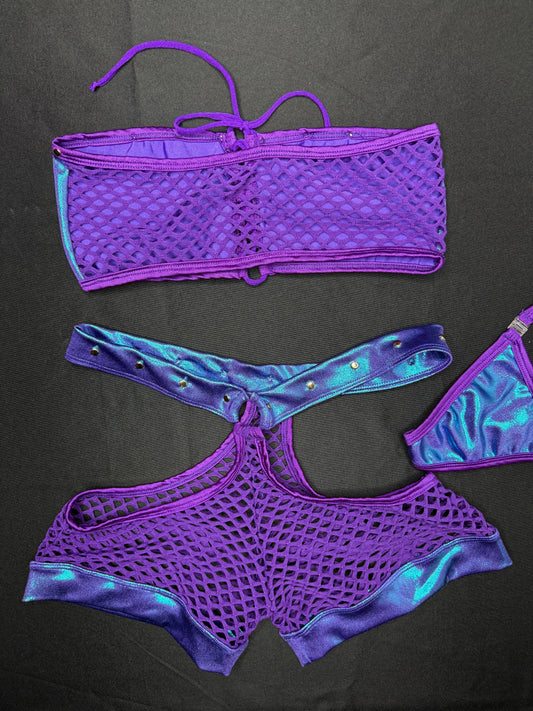 Metallic Purple/Purple Fishnet Spandex Tube Top/Shorts Two-Piece Lingerie Outfit