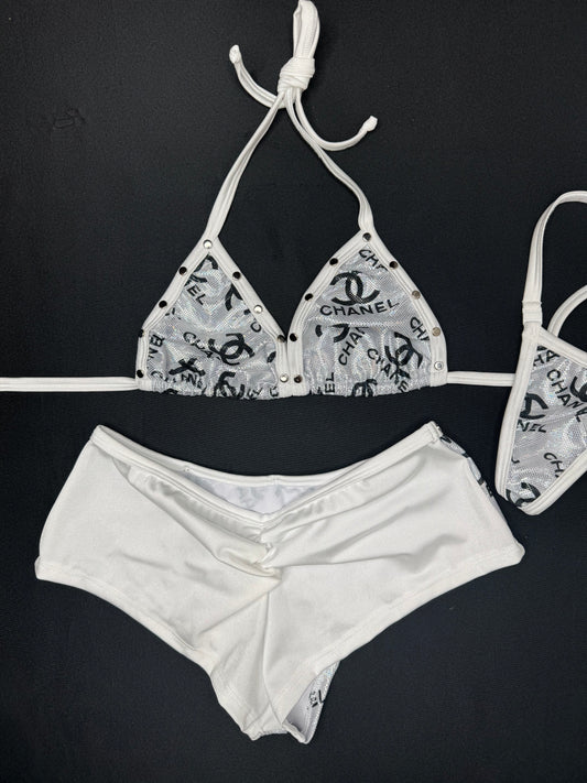 Designer Holographic Silver/White Spandex Bikini Top/Shorts Two-Piece Lingerie Outfit