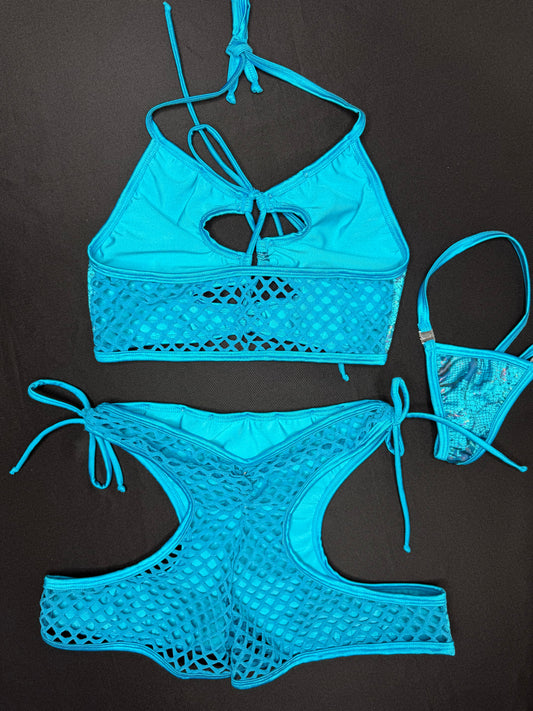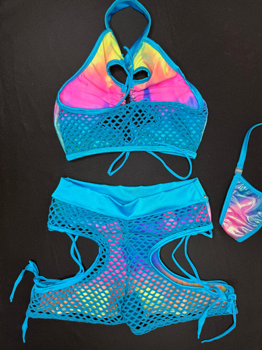 Metallic Rainbow Spandex/Turquoise Fishnet Two-Piece Lingerie Outfit