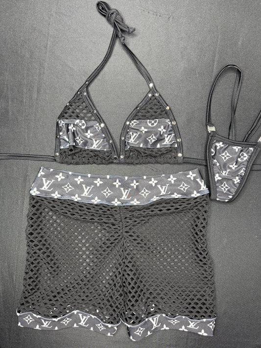Designer Black/White Spandex/Fishnet Bikini Top/Shorts Two-Piece Lingerie Outfit