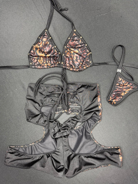 Chocolate/Black Cheetah Animal Print Spandex Two-Piece Bikini Top/Shorts Lingerie Outfit