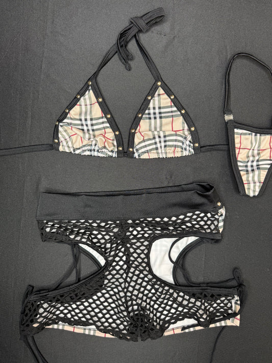 Designer Plaid/Black Fishnet Bikini Top/Shorts Two-Piece Lingerie Outfit