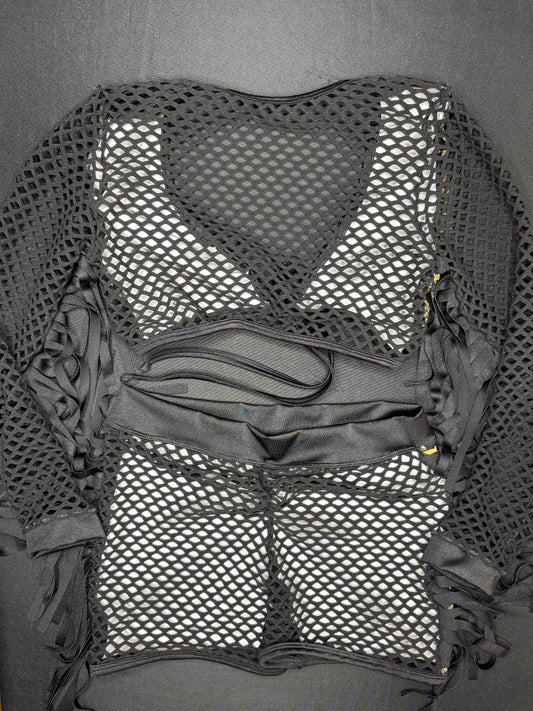 Black Spandex/Mesh Fringe Ripped Back Shorts Two-Piece Lingerie Outfit