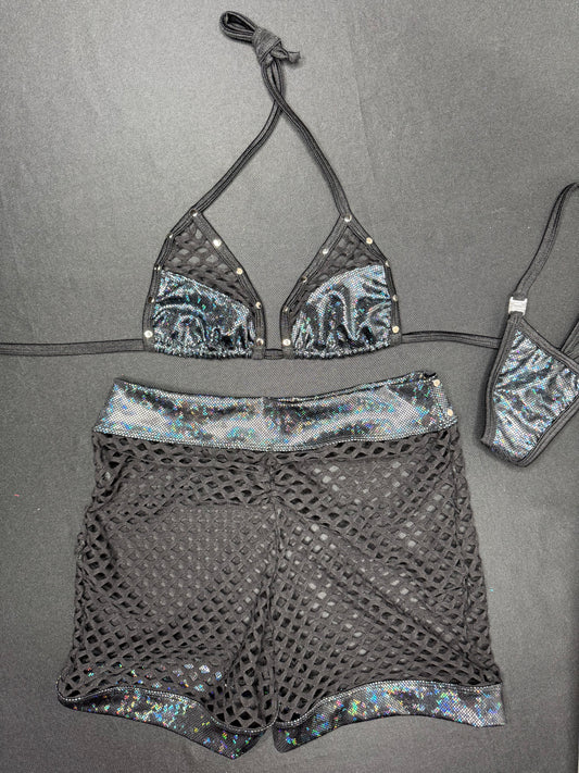 Black/Black Spandex/Fishnet Bikini Top/Shorts Two-Piece Lingerie Outfit