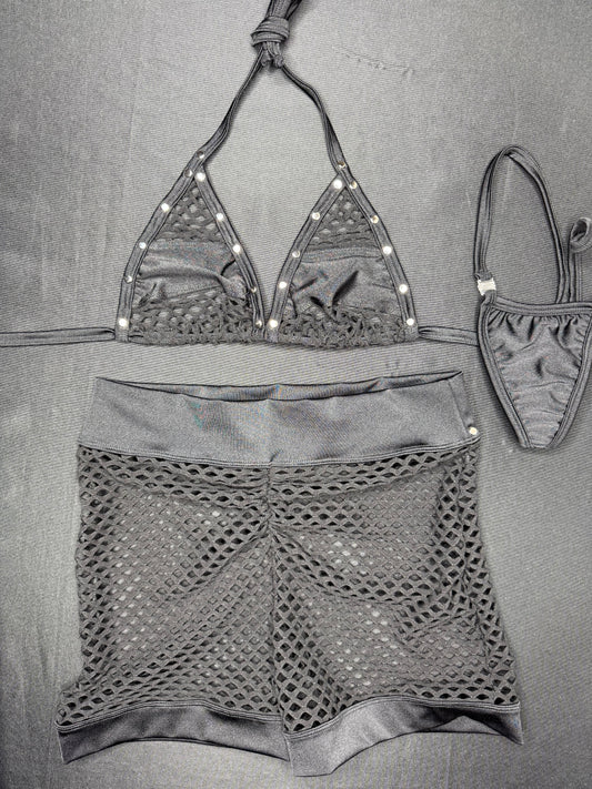 Metallic Black Spandex/Black Fishnet Shorts Two-Piece Lingerie Outfit