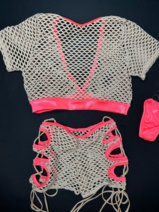 Coral Microdot/Beigh Fishnet Two-Piece Lingerie Outfit