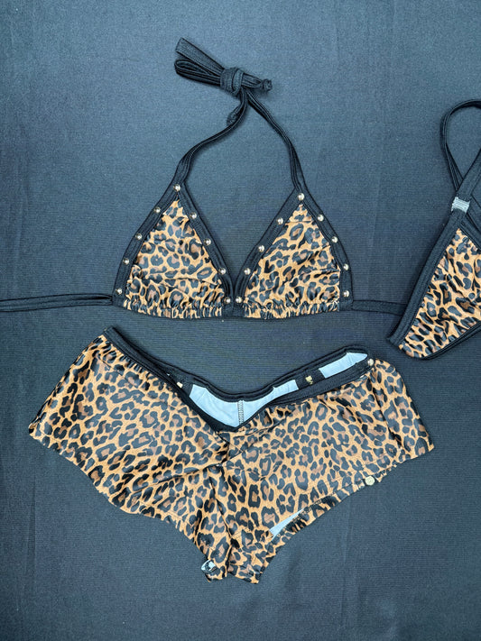 Cheetah Animal Print Bikini Top/Zipper Shorts Two-Piece Lingerie Outfit